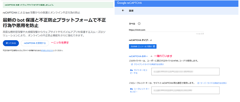 ↑また変わってしまう可能性もありますが、ログインし reCAPTCHA 管理コンソール から管理画面に行けます。